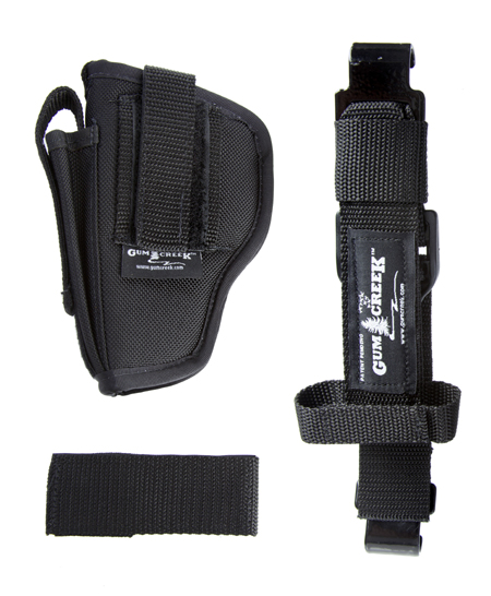 Use a common sized holster that has either a belt loop or clip on the side of the holster, located in the center. If your holster is not ambidextrous (belt loops on both sides), then you will need a left-handed holster for a right-handed draw, or a right-handed holster for a left-handed draw. We do not recommend you using a holster with more than one belt loop on the same side, snap loops, pancake holsters or paddles. If you plan to attach a wide holster, and you find the holster strap already attached to the mount is too short, simply replace the holster strap (labeled “Holster Strap”) with the longer replacement strap provided in the package. Un-Velcro and open up both the top holster strap (labeled) and the lower holster strap that is smaller in width.